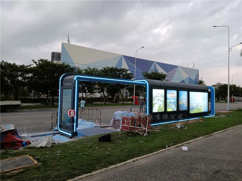 公交站臺候車亭主體顏色為灰色,采用304不銹鋼材質制作而成。海南島四面環海,海水是自然界中量大、腐蝕性較強的一種天然電解質,采用304不銹鋼材質,表面經過高溫靜電噴涂處理,可以確保公交站臺候車亭具有較好的抗腐蝕性。為了凸顯崖州灣科技城現代化的科技元素,此款候車亭頂部采用星空頂的做法,夜間會變幻出五顏六色的燈光效果。此外,在候車亭的頂部及立柱周邊也增加了LED柔性光源,進一步增加了夜間亮化效果,既美觀又實用!