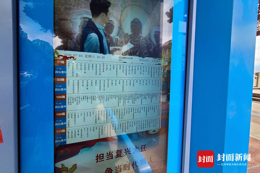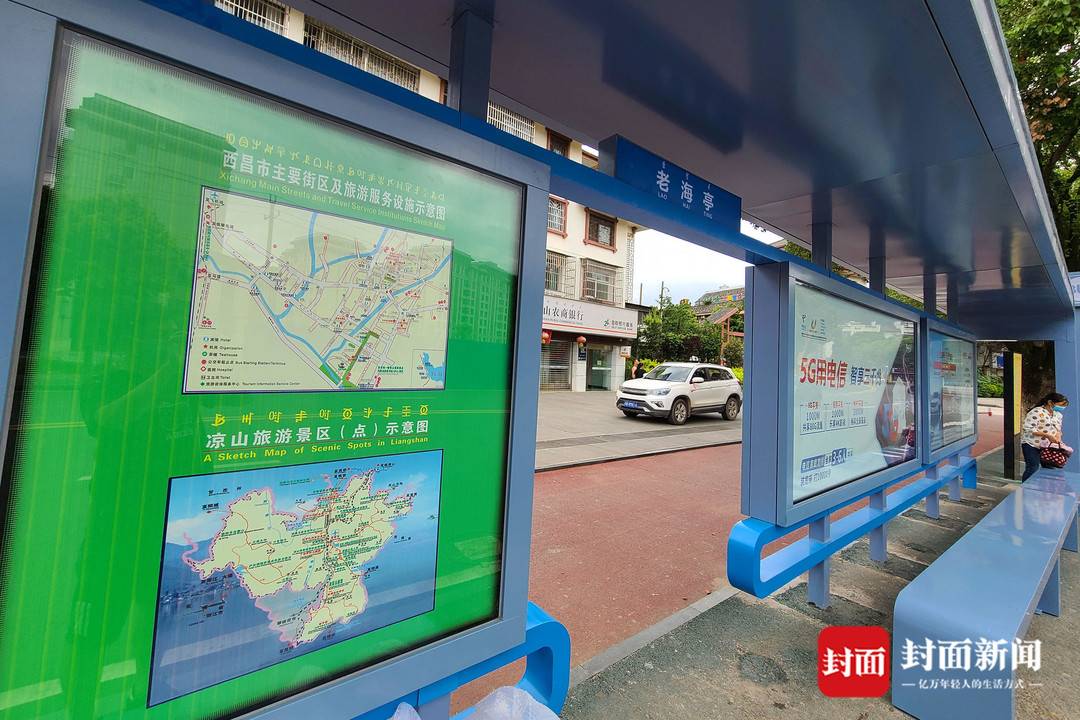 從西昌市區(qū)乘坐公交車前往邛海瀘山景區(qū),可以看到,沿線的公交站臺(tái)已經(jīng)全部換新。新的公交站臺(tái),以藍(lán)色為主色調(diào),造型簡潔,外觀大氣。候車亭內(nèi),設(shè)置有西昌市主要街道及旅游服務(wù)設(shè)施和涼山旅游景區(qū)示意圖。此外,還安裝了顯示屏,能顯示實(shí)時(shí)公交車運(yùn)行班次和距離本站的距離等信息。